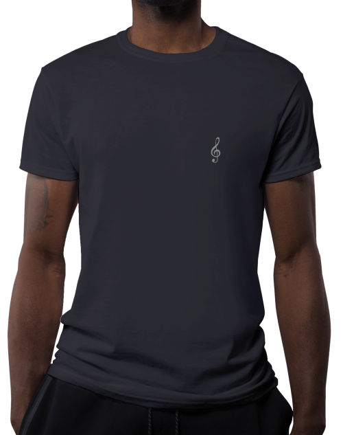 Camiseta em malha 100% Algodão fio penteado 30.1, cor preta com estampa de uma clave de Sol minimalista